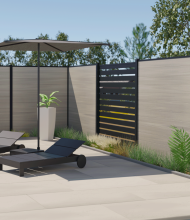 Panele ogrodzeniowe BOSTON można zaprojektować poprzez połączenie kilku wybranych elementów i dekoracji: szczotkowanych desek kompozytowych w różnych kolorach z deskami aluminiowymi, które wzmacniają sztywność drewnianej ściany osłonowej.
